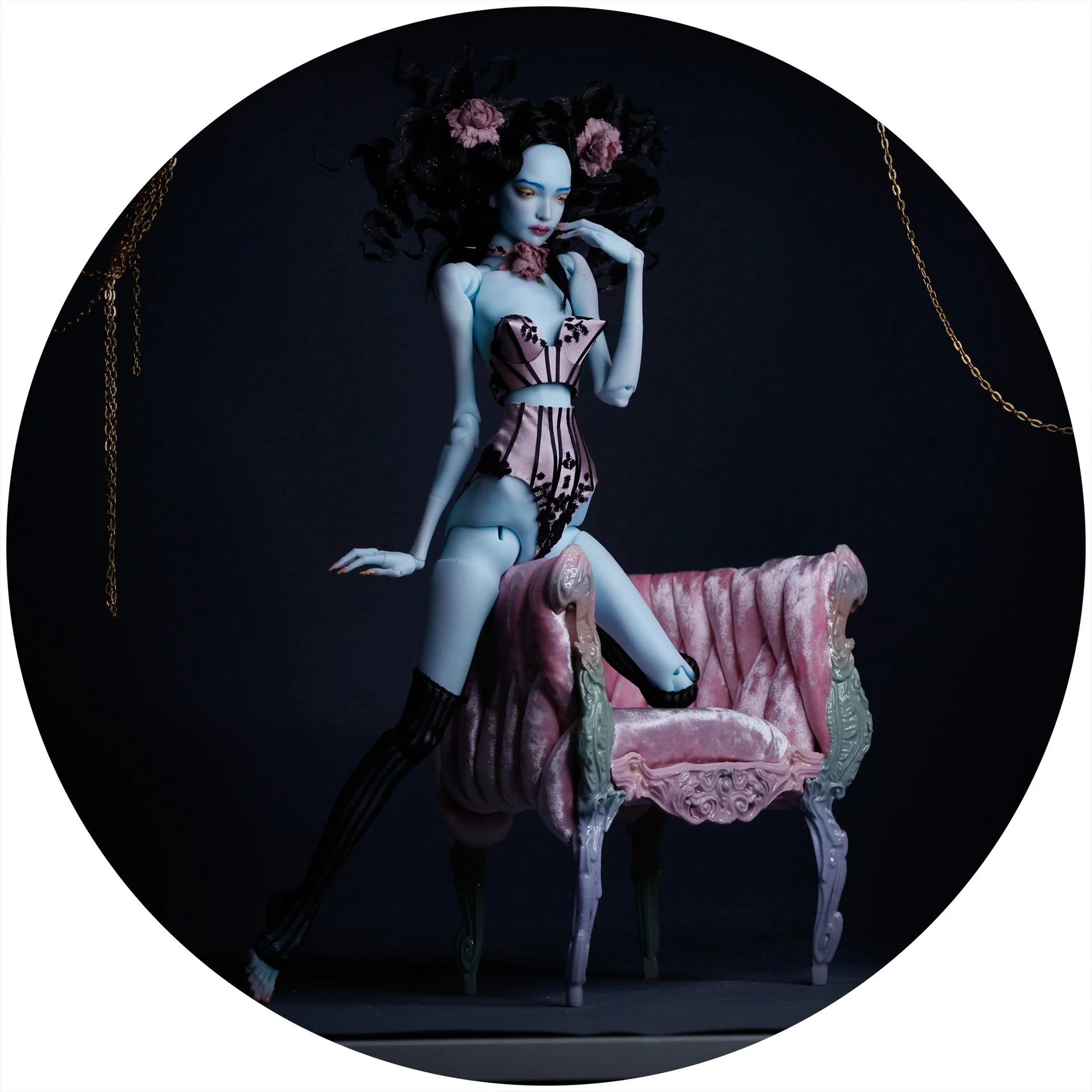 A 4th Gen, Blue Blood, Idea sculpt with Small Bust that comes as shown with faceup and bodyblush and features the Silk Bisque lamination technique on the face that mimics the texture of porcelain. She comes with pose A manicured hands with gold accents and pedicured feet.