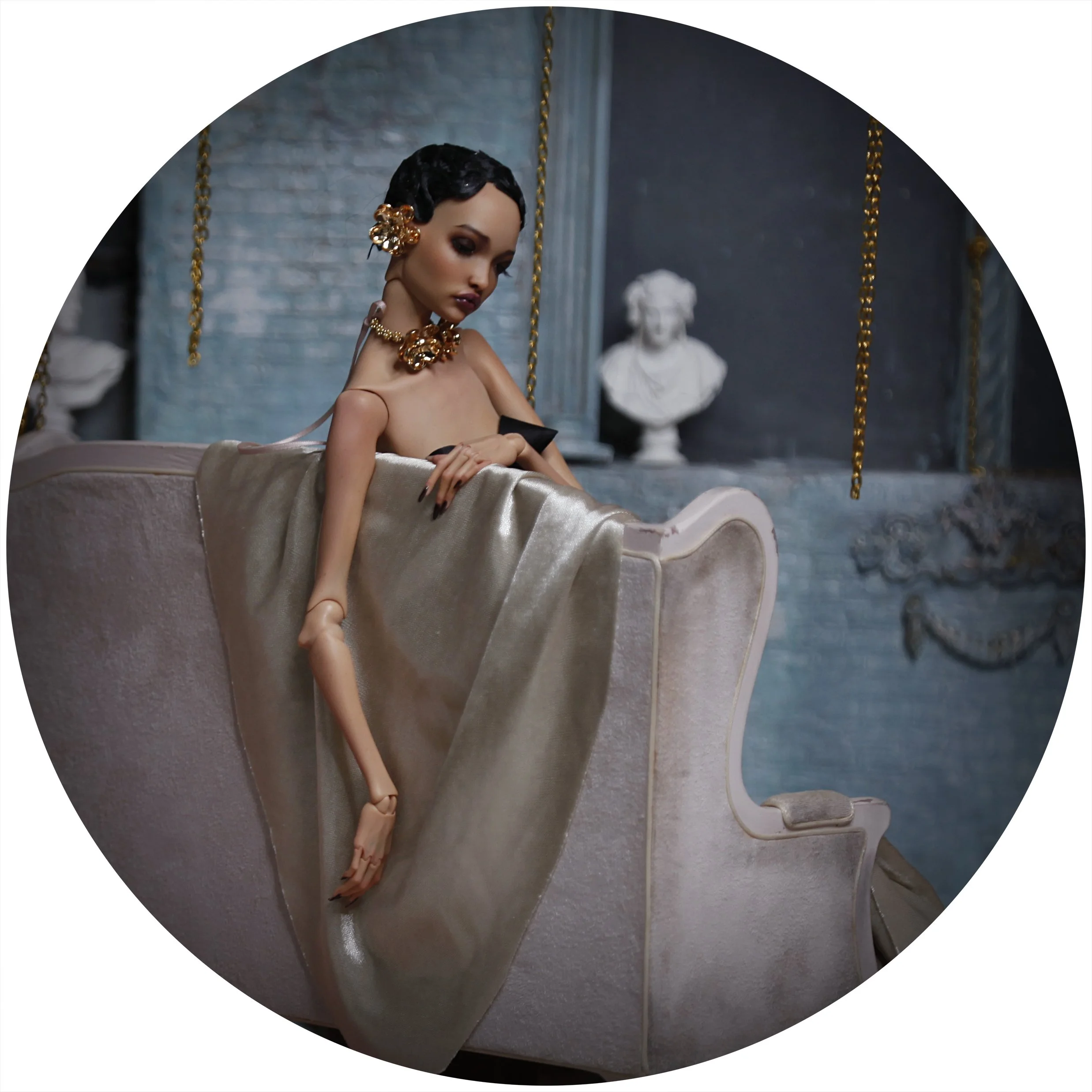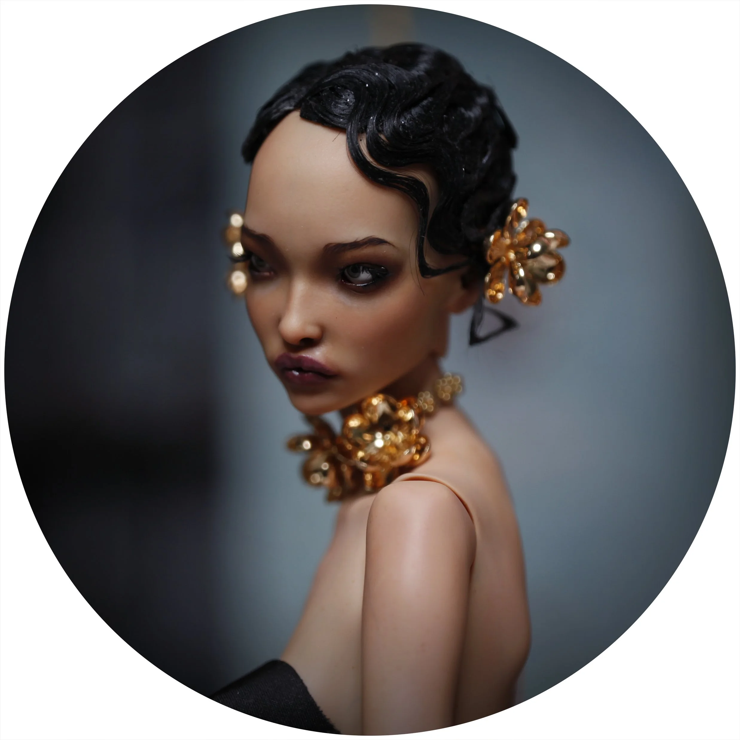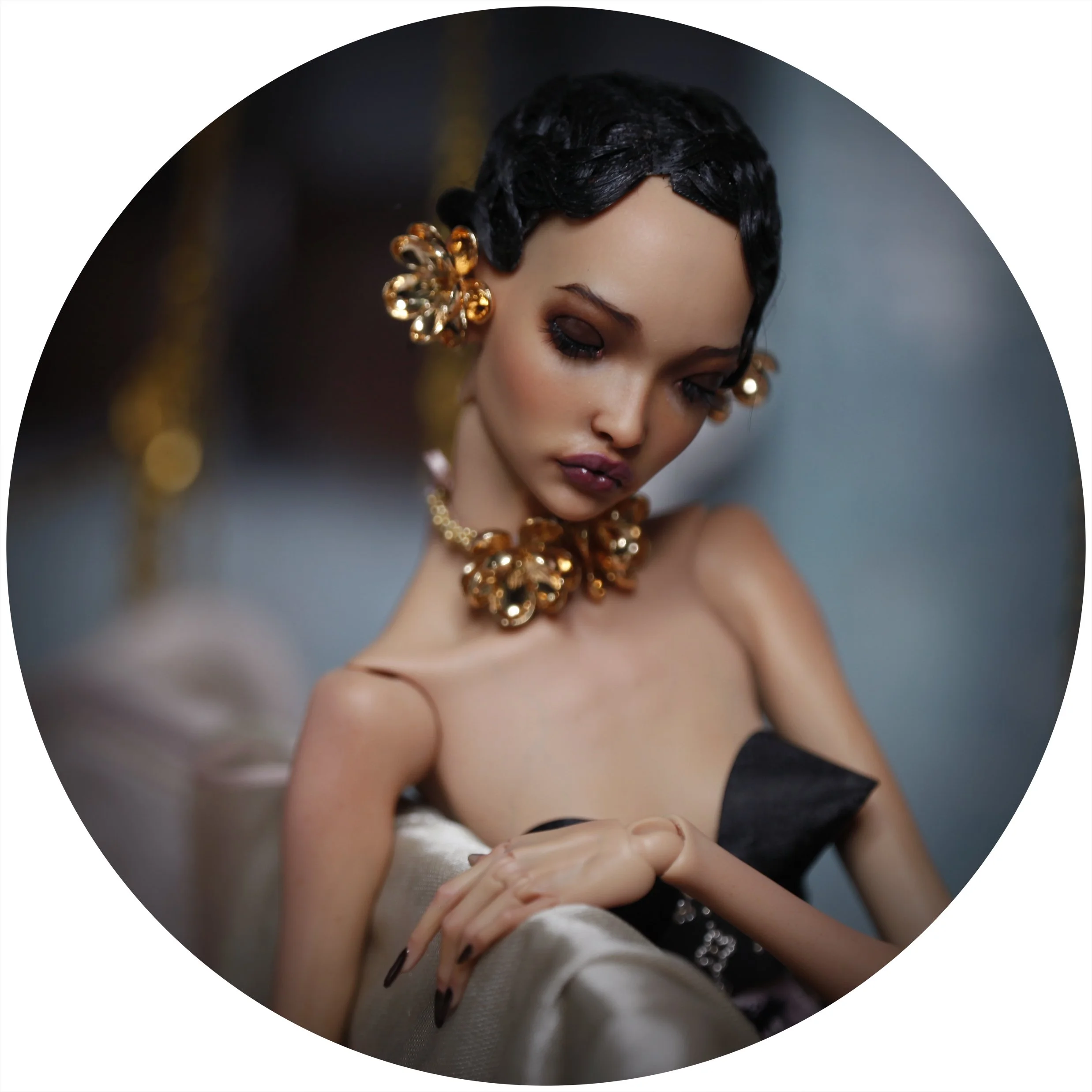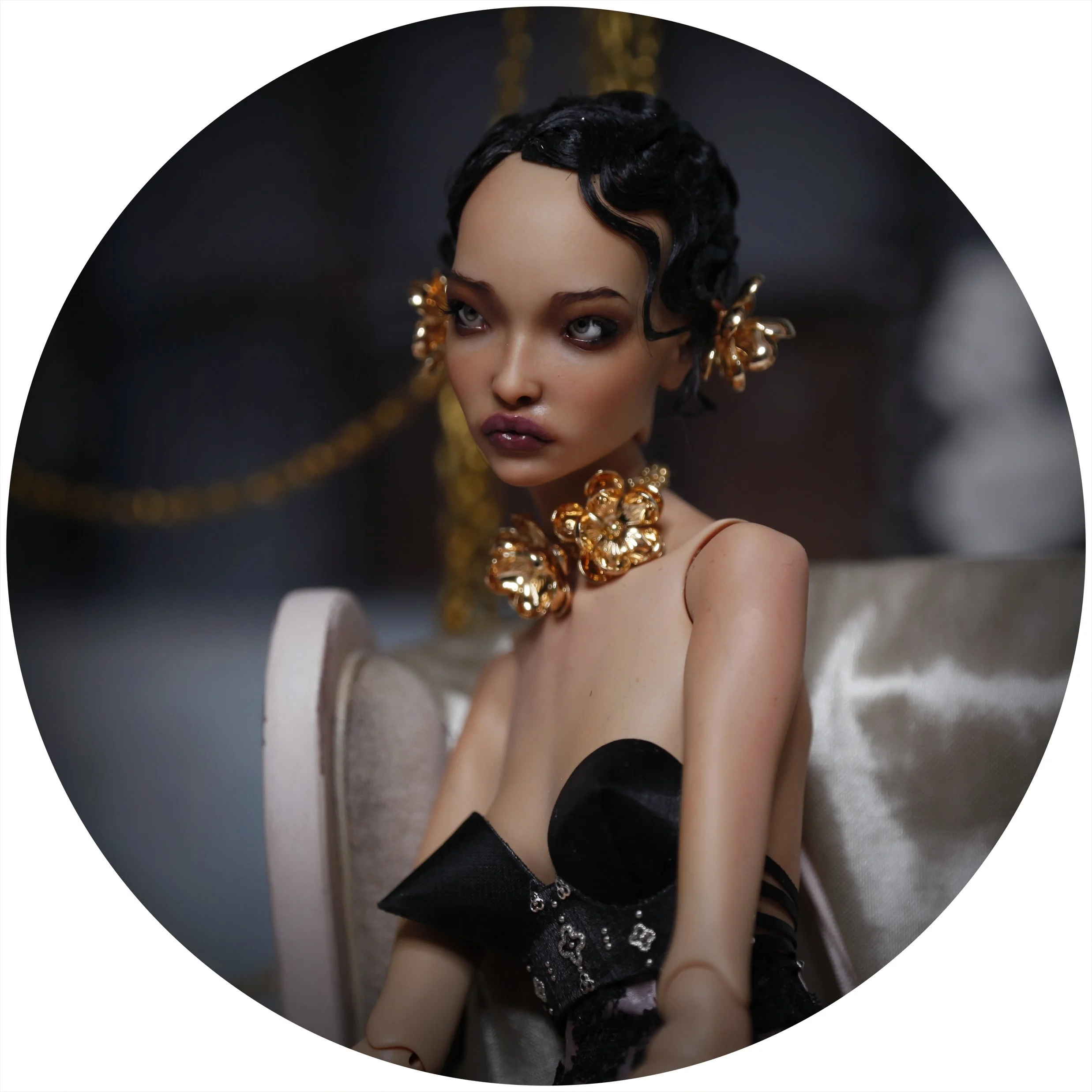 Her name is Golden Aurelia. Draped in silk and shadow, she carries an air of quiet power—every glance deliberate, every movement as if the world itself were her stage.